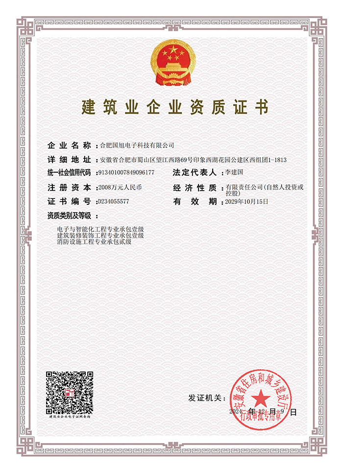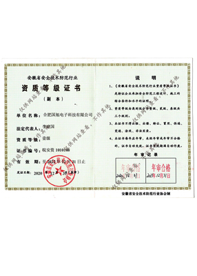 公司現已獲得承裝(修、試)電力設施許可證、電子與智能化工程專業(yè)承包壹級資質、建筑裝修裝飾工程專業(yè)承包壹級資質、消防設施工程專業(yè)承包貳級、安全技術防范行業(yè)壹級資質、雷電防護裝置檢測資質證乙級資質、安全生產許可證、通過ISO9001:2015質量管理體系認證、ISO14001:2015環(huán)境管理體系認證、OHSAS18001:2007職業(yè)健康安全管理體系認證等榮譽。我們還將進一步努力,爭取贏得更多的榮譽。